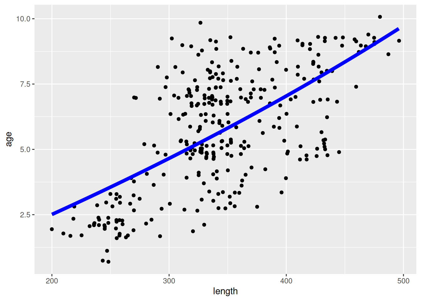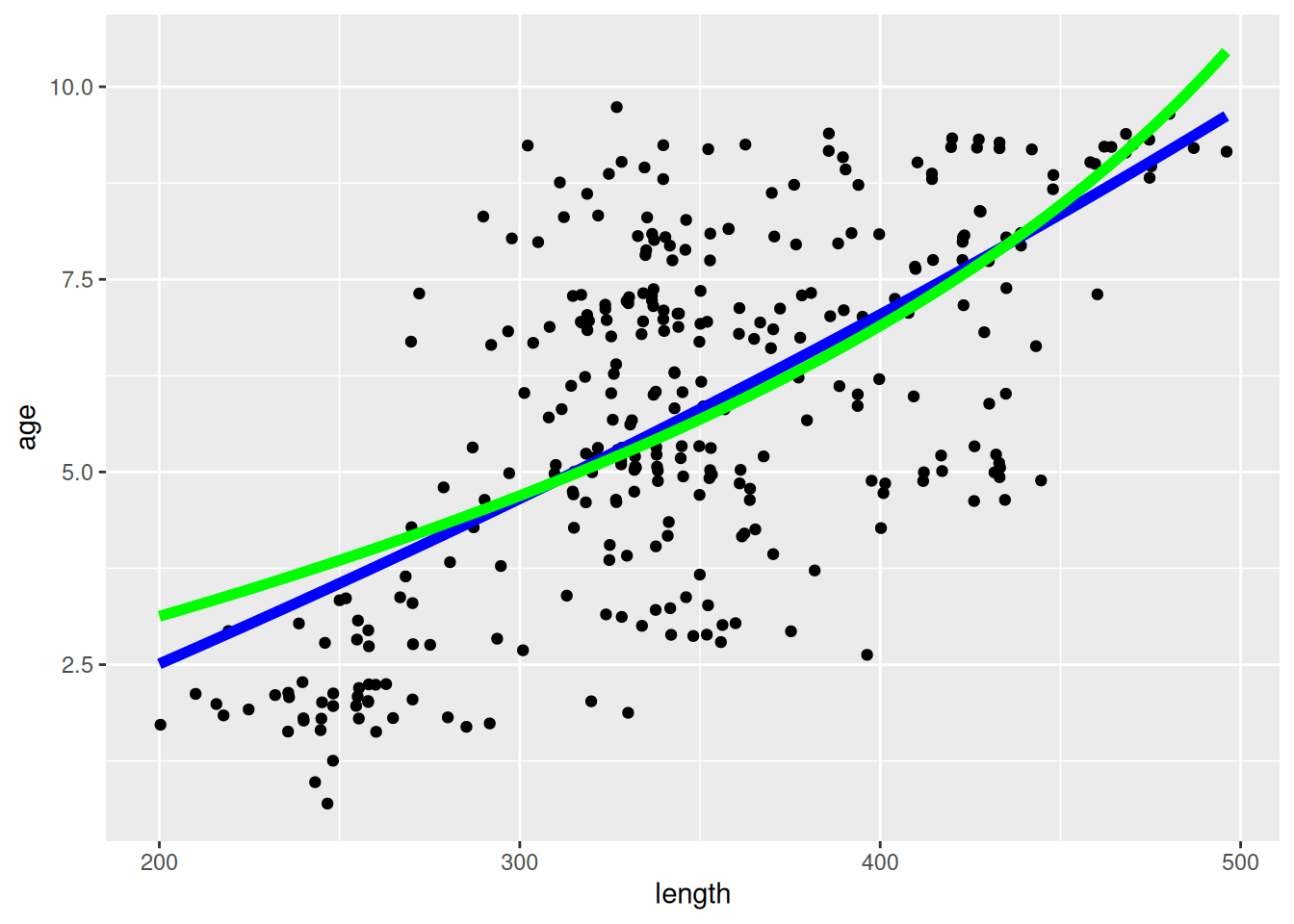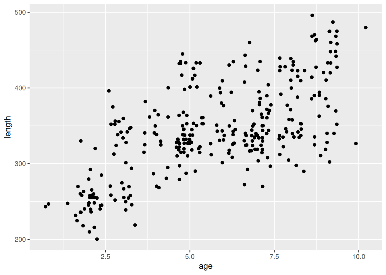 geom_jitter(aes(x = length, y = age)) +