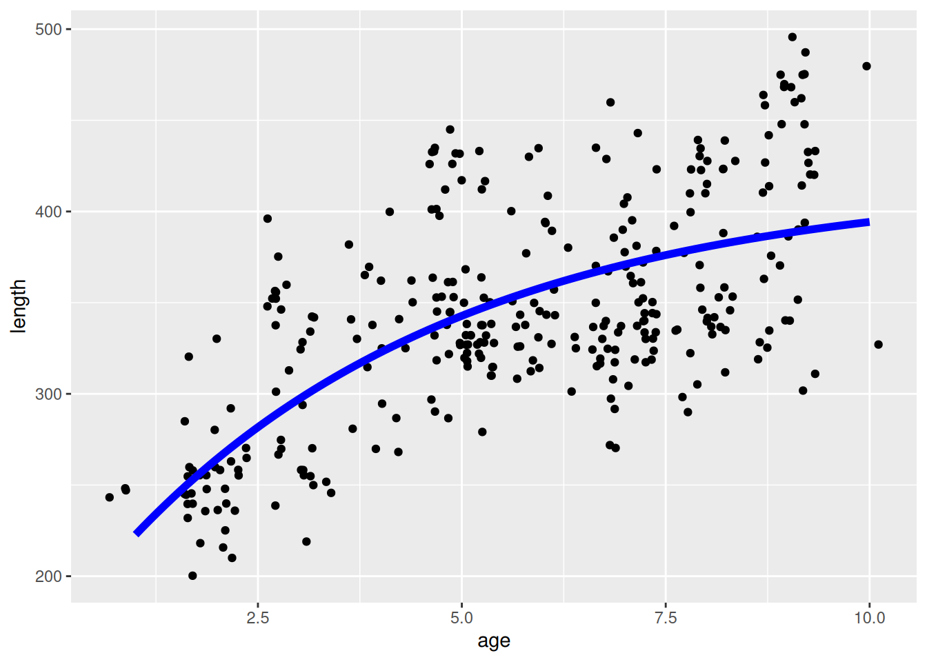 Given that we are now dealing with the size-based growth curve, we plot the length on the x axis and the age on the y axis.